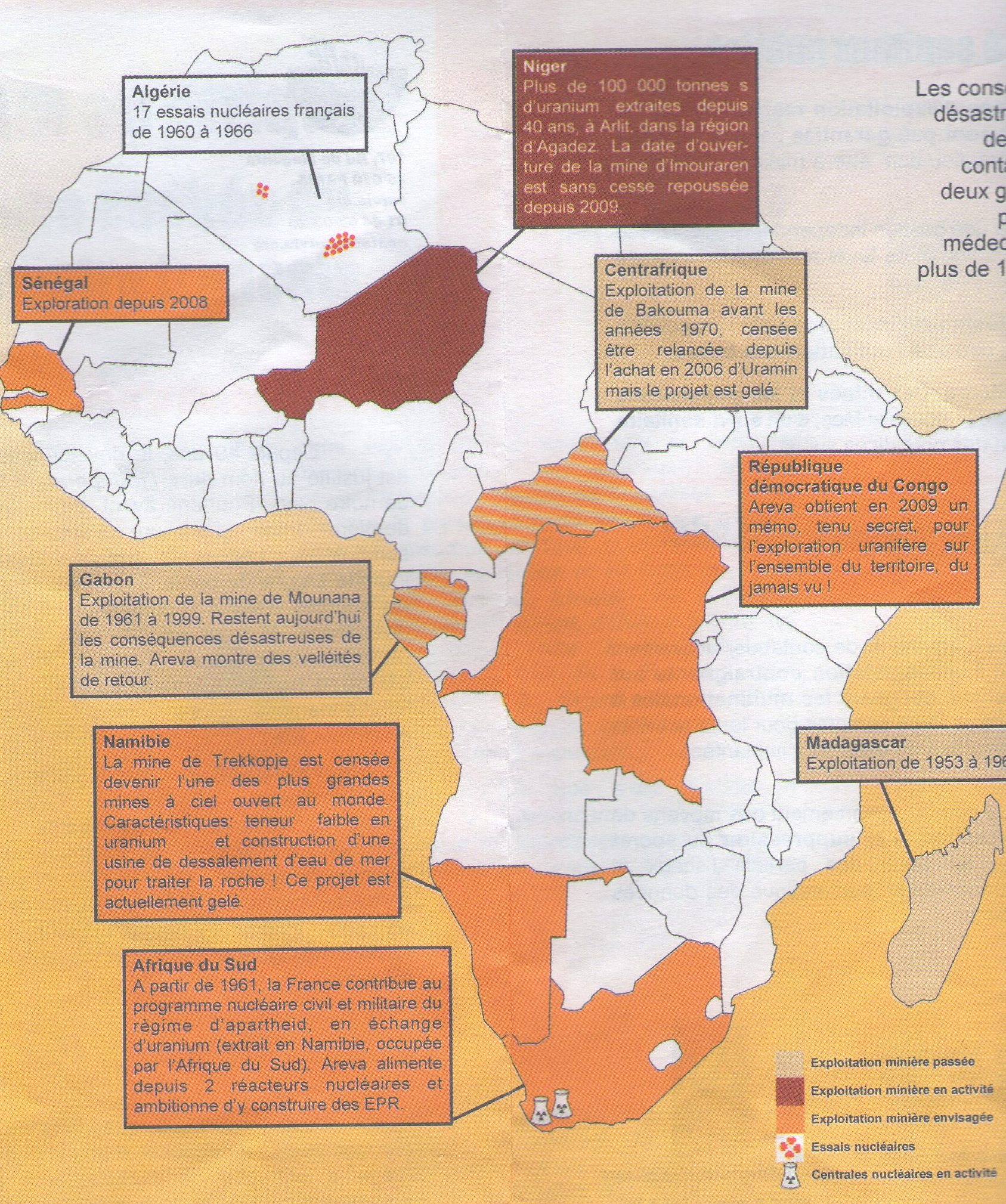 :1961年から、フランス政府は国内にあるウランと引き換えに、アパルトヘイト国家による原子力の平和・軍事利用計画に協力し続けている。例えば、ナミビアでの採掘は南アフリカが管理することになっている。一方で、アレヴァ社は2基の原子炉を管理し、EPR(欧州加圧水型炉)の建設も狙っている。